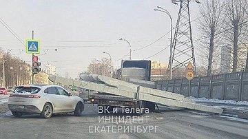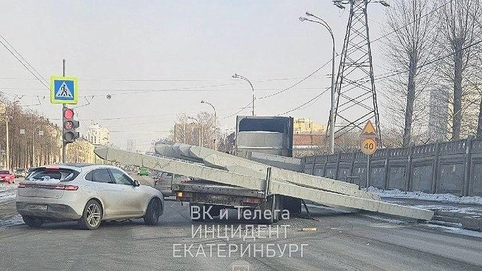 На Уралмаше, в районе пересечения улицы Донбасской и переулка Никольского, с грузовика на ходу выпали железобетонные балки, которые полностью перекрыли дорогу.