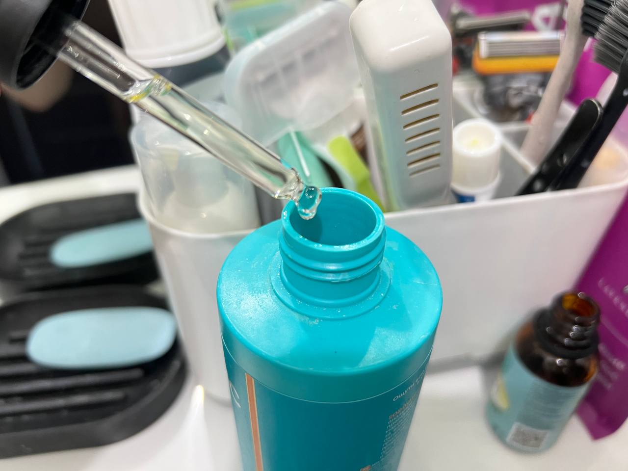 - Добавление в шампунь (самый удобный способ). Во время мытья нанесите на влажные волосы обычную порцию вашего шампуня и вспеньте. Затем капните прямо в пену на ладони 2-3 капли тиамина из ампулы, смешайте и аккуратно вотрите эту смесь в кожу головы. Помассируйте 1-2 минуты и тщательно смойте водой.