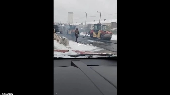 В Екатеринбурге сегодня, несмотря на снегопад, дорожные службы продолжали укладывать асфальт, сообщает телеграм-канал Е1.RU.