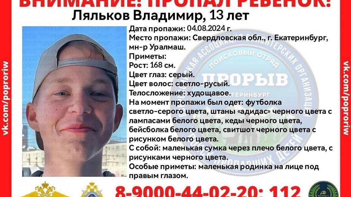 Если у вас есть информация о местонахождении мальчика, пожалуйста, сообщите об этом волонтерам поискового отряда «Прорыв» по телефону +7 (900)-044-02-20. Также можно позвонить по номерам 112 или 102.