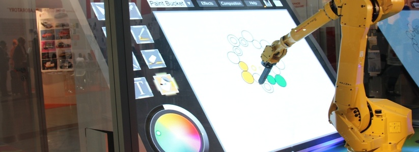 Робот-художникОгромный желтый робот с крупным компьютером-планшетом расположился под стеклом. Он активно вращается и рисует на экране разноцветные круги, представляющие собой логотип «Иннопрома».