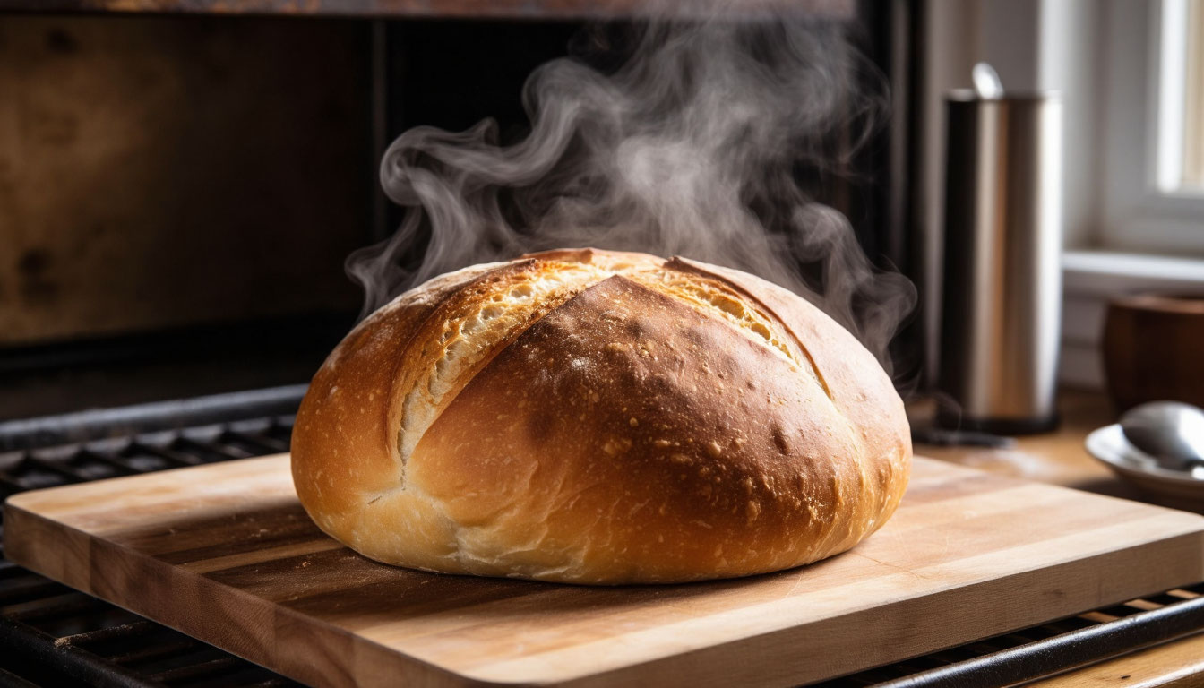 Лайфхак: Чтобы корочка получилась идеальной, в первые 5 минут выпечки сбрызните хлеб и стенки духовки водой из пульверизатора. Пар создаст нужную среду для образования хрустящей оболочки.