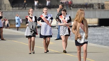 Наряд для выпускниц можно приобрести за 7 750 рублей с платьем или за 3 900 рублей с классической формой с белым фартуком. Туфли в среднем стоят 2 400 рублей, вечернее платье – 4 700 рублей, школьная форма – 1 500 рублей. Наборы из лент, колокольчиков и бантов для волос обойдутся около 650 рублей.