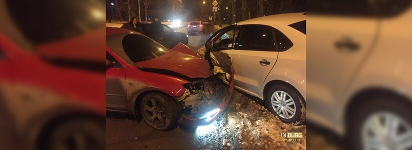 В Екатеринбурге на улице Гагарина столкнулись две иномарки. Как сообщают пользователи соцсетей, авария произошла в ночь на 30 декабря.