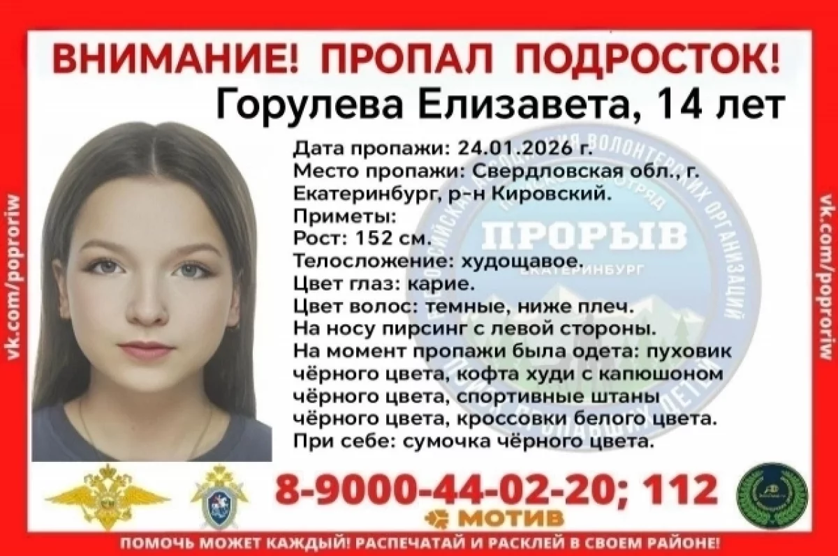 В Екатеринбурге вторые сутки продолжаются поиски пропавшей 14-летней Елизаветы Горулевой.