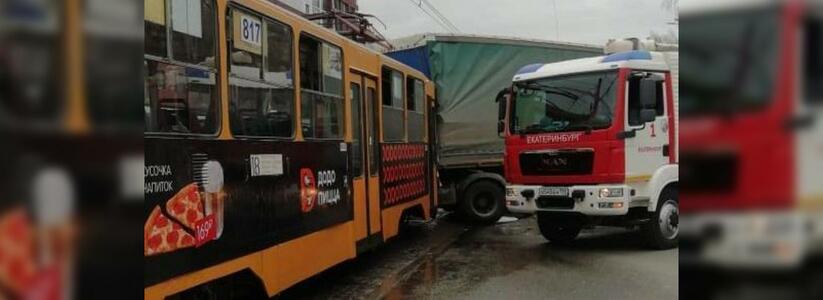 Сегодня утром около 07.40, 28 апреля, в Екатеринбурге на улице Раевского грузовик врезался в трамвай с пассажирами. Два человека пострадали.